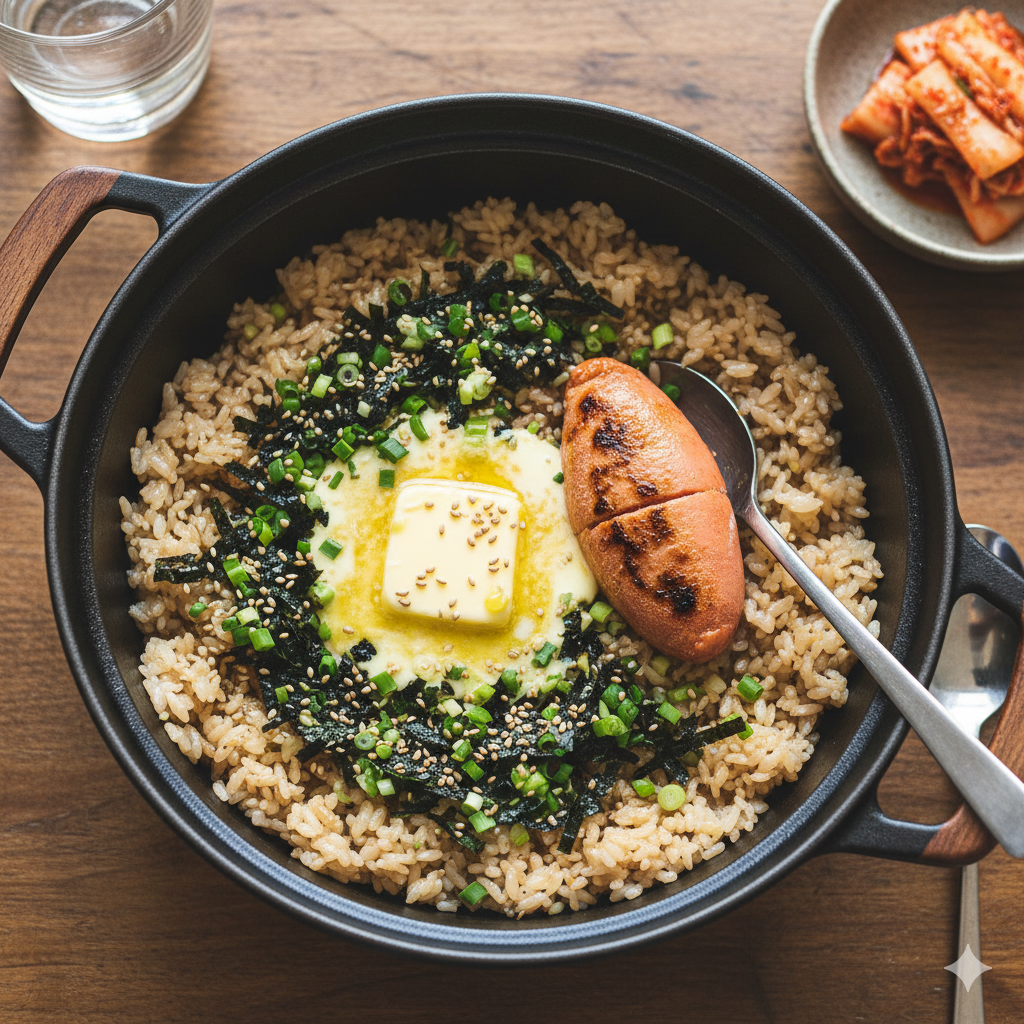 그래서 제가 찾은 방법은 **'버터는 마지막에! 안 익은 채로!'**입니다. 갓 지은 뜨거운 솥밥 위에 생 버터를 한 조각 올려 밥의 잔열로만 녹여주는 거죠. 이렇게 하면 버터의 신선하고 고소한 향이 그대로 밥에 스며들어 풍미가 최고조에 달합니다. 밥을 다 섞을 때까지 버터가 녹아내리는 그 모습도 정말 맛있어 보인답니다.